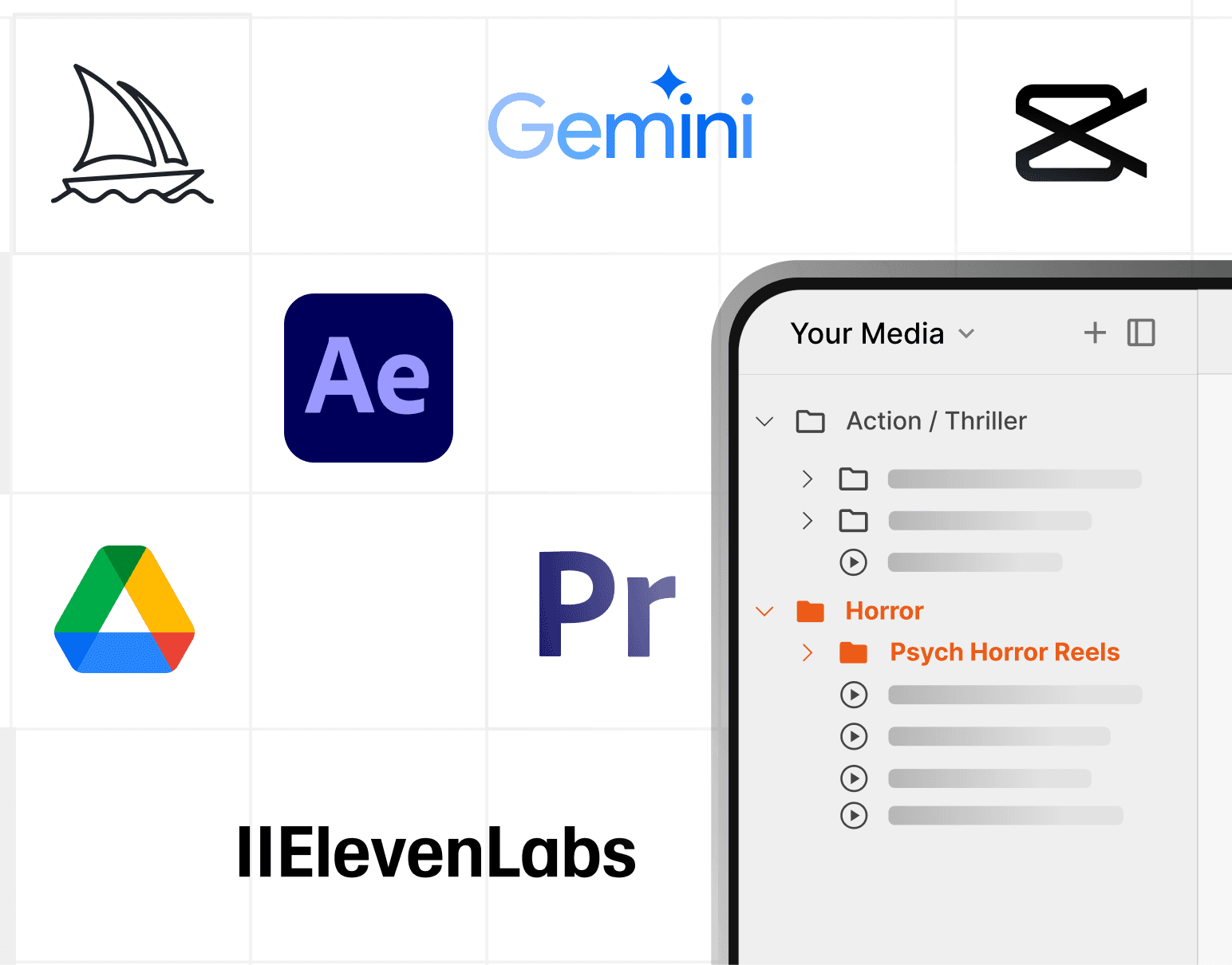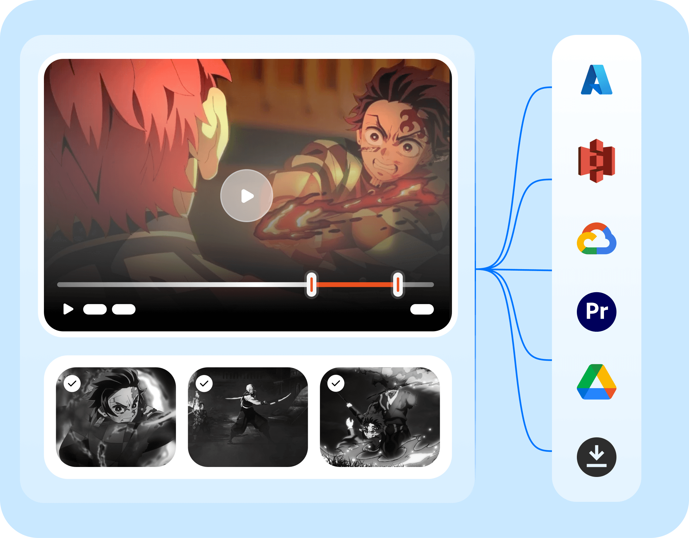 Turn media into clips, reels, dubbed cuts, and rough edits powered by AI — export to Premiere/Resolve, or straight to your publishing stack.
